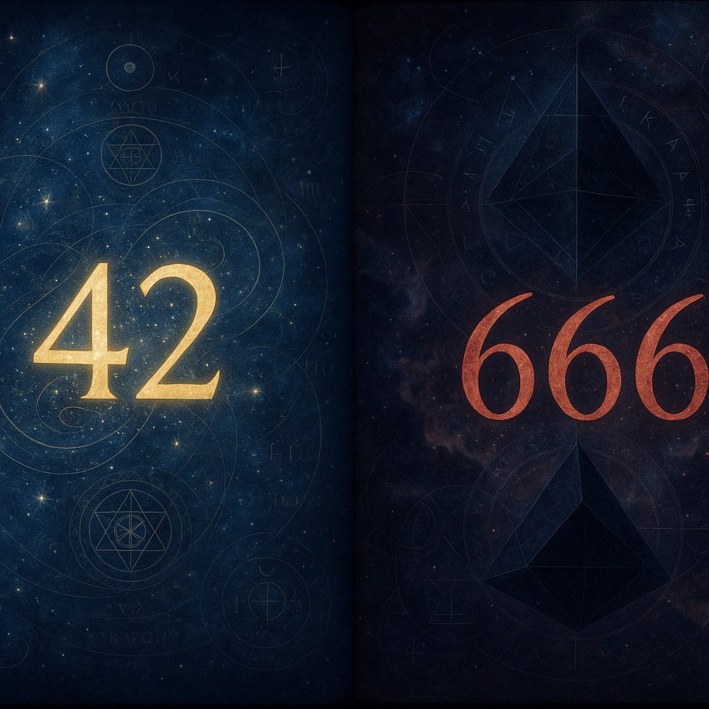 [Crescendo begins: two figures emerge — 42 (golden spiral), 666 (burning grid)]